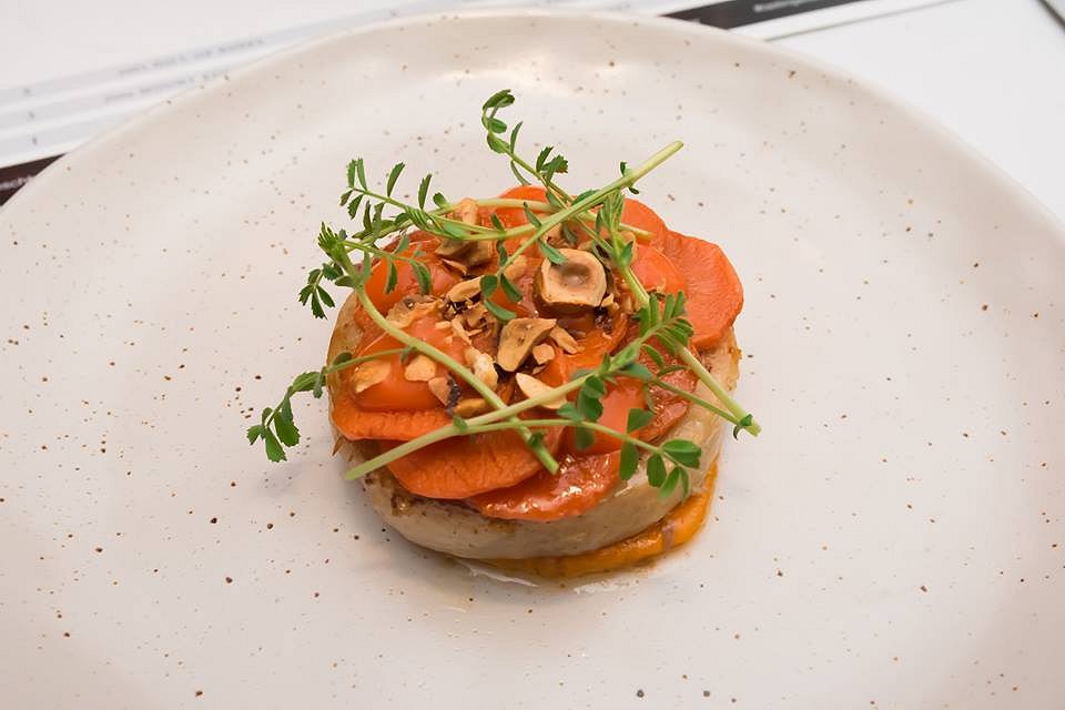 Whole Duck, Spiced Carrot, Fermented Cumquat, Hazelnuts, Chickpea Shoots