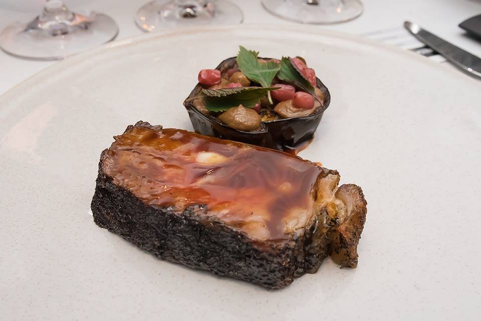 The top of the line strip of beef was crusted in Hill of Grace vine leaves that were dehydrated and toasted. This mimicked the taste of meat being cooked over an open fire. The savoury flavours of the eggplant were balanced by the herbacious riberries and the prominent taste of black garlic. These were matched perfectly with the shiraz which was elegantly structured, vibrant in aroma, and had distinct taste of five spice on the palate.