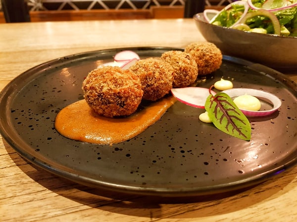 We started off with the Beetroot and Vodka Salmon Gravlax and the Crumbed Beef Brisket Ball as an entree. What a wonderful way to start off. Two dishes that strikingly contrast each other. The Gravlax is a unique dish that is simple in its preparation. The salmon is served raw like Sashimi and accentuates a chill and fresh flavour with candy cane beetroot and pickled shallots to complement. The Brisket Ball takes the complete opposite approach to this. Its beef in a ball, can’t get more back to basics then that. Yet the preparation and cooking time that goes into this to give it that melting creamy texture far exceeds that of the salmon.