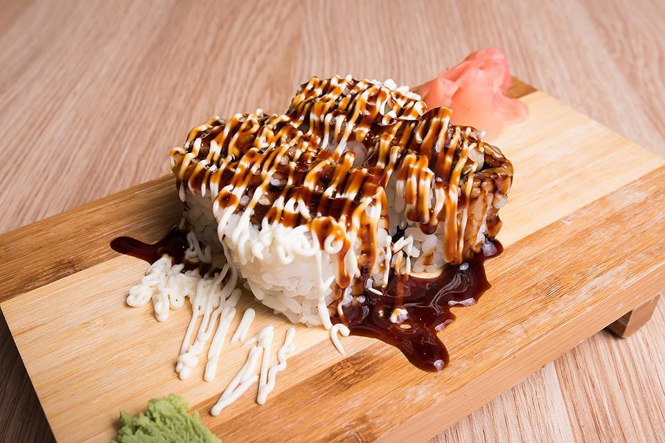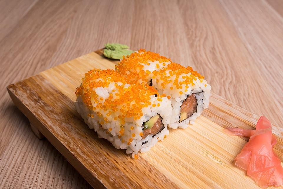 Salmon, avocado, and mayonnaise wrapped in rice and seaweed, and garnished with fish roe, this classic sushi combination did not disappoint.