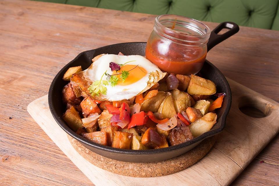 With generous cubes of both roasted white potato and sweet potato, this dish is great for sharing! Served in a skillet and tossed with a house made mix of chorizo, capsicum, and red onion, topped with a sunny-side-up egg along with a side of Napolitana sauce, this dish is rustic yet bursting with flavour.