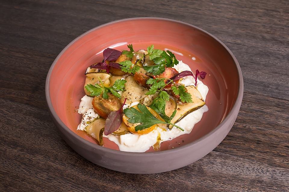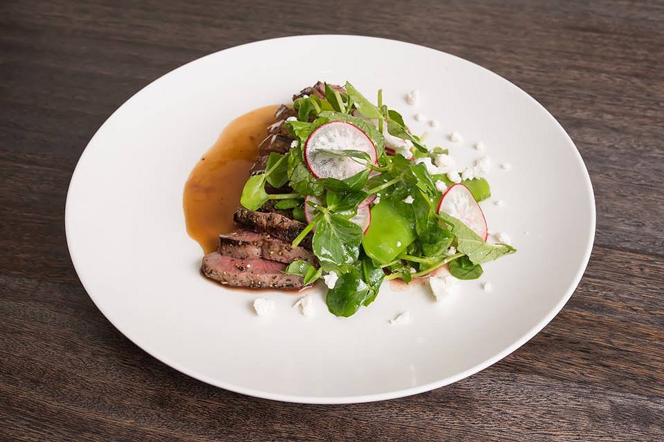 The nights are getting cooler yet the Grilled Lamb Loin with a pea, radish and feta salad inspires a spring vibe. The bright green pea tendrils and snow peas pop against the slices of pink lamb and fine radish. The classic combination of pea and lamb is completed with a rosemary glaze. The meat is incredibly tender and melts to the bite without a hint of protest.
