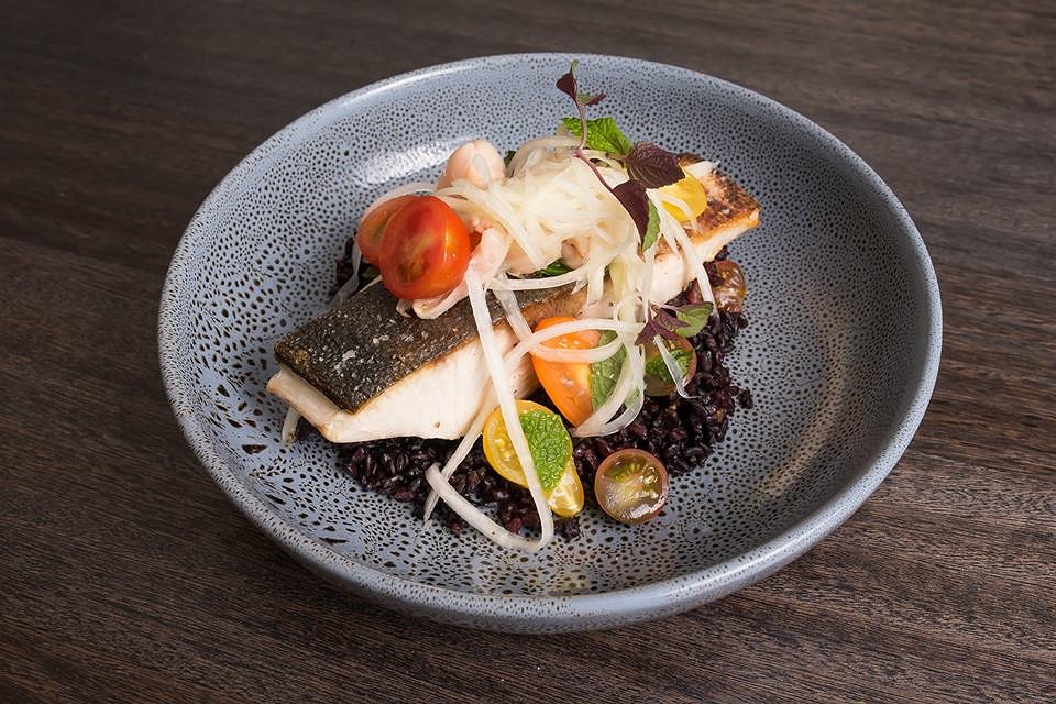 The pan-fried Hiramasa Kingfish is served with a green papaya and lychee salad that is so fresh, summery you feel transported to a tropical island. The kingfish boasts a superb crust, topping the flakey fish and a bed of black rice supports the tropical flavours.