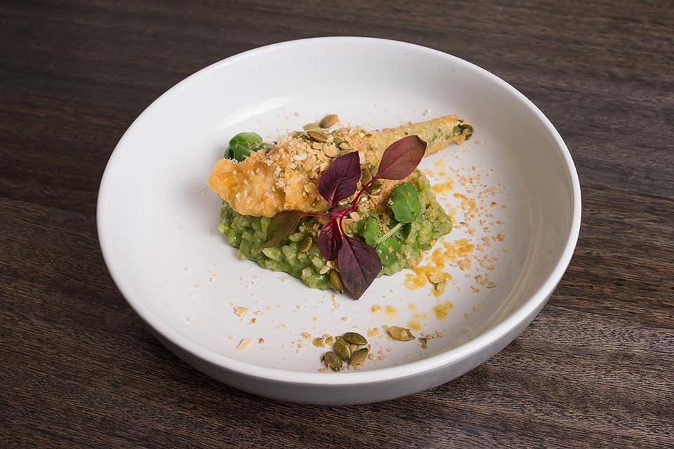 Despite the attractiveness of the Zucchini Flower with its noticeable crispy shell, I plunge my fork straight into the vibrant watercress risotto and am instantly rewarded with a bite of creamy rice with that is so flavourful and immaculately seasoned. I’d be happy with a plate of this risotto alone, but I happily move onto the flower itself and the heavenly light, yet crisp outer shell. Even more crunch is delivered by a scattering of pepita crumb and crushed macadamias, juxtaposed by a filling of a luscious, velvety pumpkin mousse. One word – Divine.