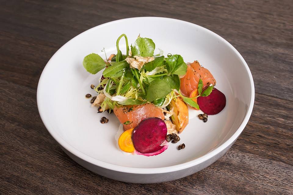 First up we choose the Salmon Gravlax cured with KI vodka. I love the tribute to great South Australian produce here in the rosettes of delicate salmon. Shaved beetroot, black barley and endive dance over the salmon, underpinned with delicious goats curd and a sublimely sweet grilled pear.