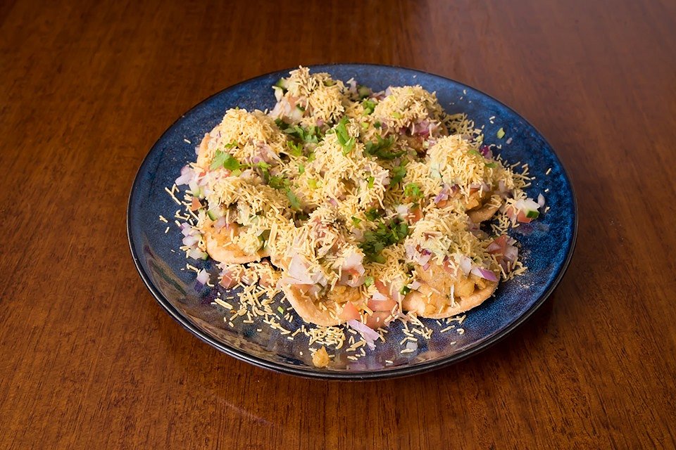 For something new we tried the Papdi Chaat; crispy fried dough wafers topped with potatoes, finely chopped tomato, onion cucumber, mint and tamarind sauce. These little one bit morsels are topped with a shredded baked chickpea batter giving loads of crunch. A canape style starter, it’s lucky there are so many because one is not enough.