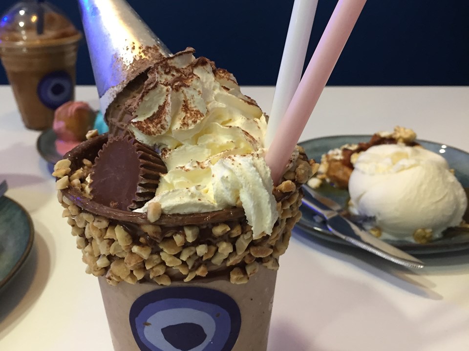 At the VIP tasting, we compared two thickshakes: Milk & Cookies and Reese’s Peanut Butter. The Milk & Cookies flavoured thickshake cup is coated in white chocolate and crushed Oreo. On top, there is whipped cream, an Oreo ice cream cookie sandwich (full size – no mini substitutes), three Cadbury biscuit fingers in white and milk chocolate and, finally, dusted in crushed Oreos. The Reese’s Peanut Butter thickshake is similarly over-the-top with a Reese’s peanut butter and chocolate ice cream cone and a mini peanut butter cup. The thickshake is peanut butter and Nutella flavour – made with Reese’s peanut butter syrup shipped from the US – and the cup is coated in Nutella and crushed peanuts. Lastly, topped with whipped cream and dusted in chocolate. You can see why it was hard to determine a winner.