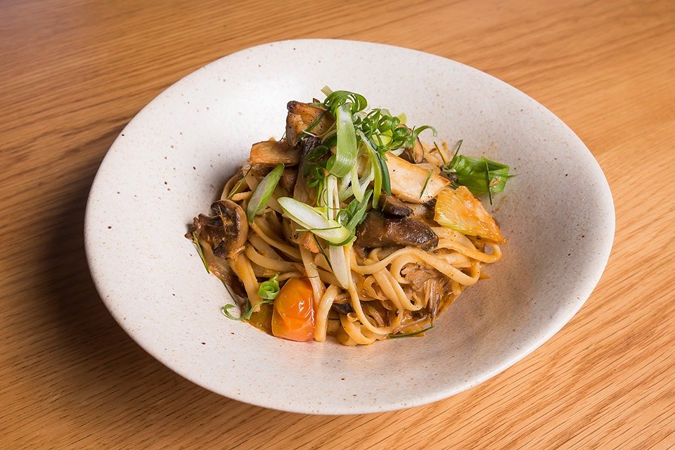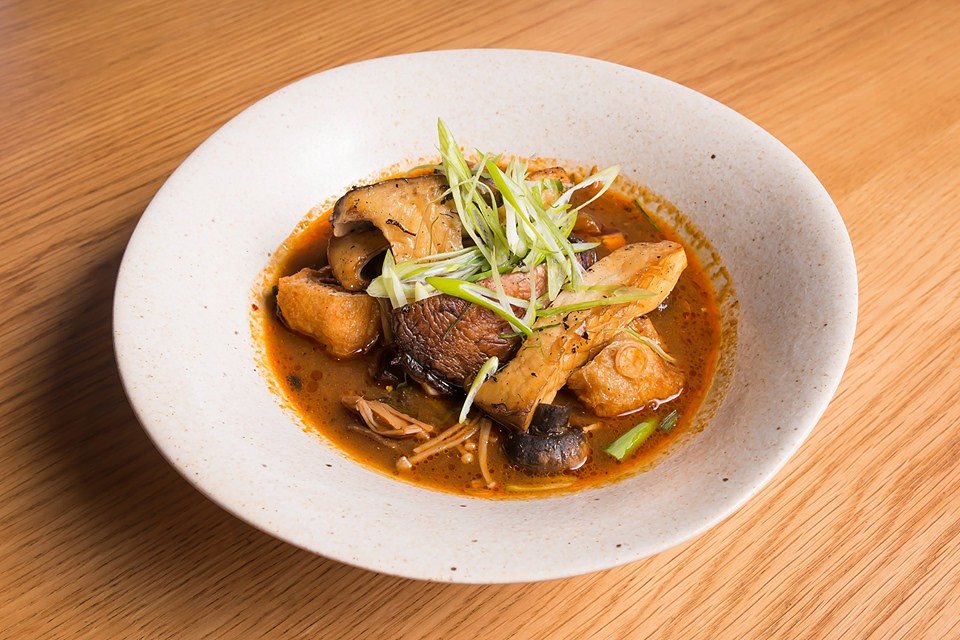 This one goes out to the mushroom lovers out there. In a salty soy/shiitake broth lies a mushroom medley with the likes of grilled king oyster, portobello, enoki, and field mushrooms, along with cherry tomatoes, slow cooked carrots, radish and spongey tofu puffs to soak up some of that delicious broth. The broth itself is rather salty, so keep a glass of water on hand. Although there’s heaps of earthiness derived from the ‘shrooms…almost like a Thai minestrone. In classic king oyster mushroom style, they have a meat-like texture, almost like the fatty part of a steak, making for a super hearty time.