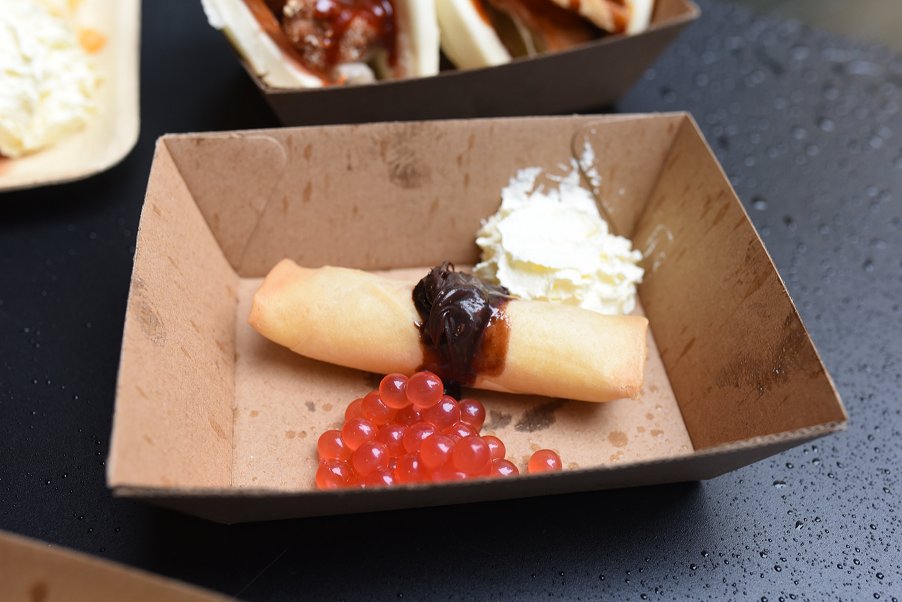 The warm and kind faces at Bao+ were serving up steamed bao buns filled with crispy pork, fish katsu, teriyaki chicken, Korean chicken and tofu. The Tofu Bao consisted of marinated tofu, tomato and lettuce, while the Korean Chicken Bao contained crispy chicken fillet, coriander and lettuce. Both streamed bao buns were beautifully fluffy, I only wish the lettuce and tomato could be replaced with complimenting additions to tofu like pickled vegetables or mushroom. Bao+ also serve up delicious desserts including New York Cheesecakes in Apple Crumble and Oreo flavours. The dessert we could not resist was the Strawberry Cheesecake Spring Roll. The roll is filled with cream cheese and strawberry, coated in a crispy shell and topped with strawberry bursting boba – small juice balls made from a seaweed extract with fruit juice flavouring inside that pops once bitten into – and cream. The soft fillings and outside crunch combine well to bring the cheesecake flavour, not texture, to a spring roll.