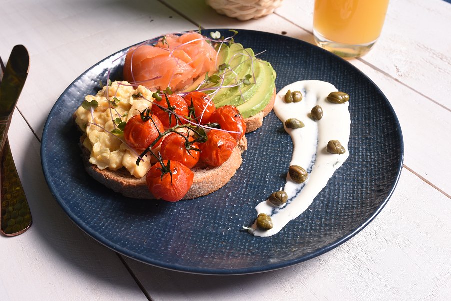 A classic option with a twist! The usual crowd winning ingredient combination of smoked salmon, scrambled eggs, avocado, grilled tomatoes is carefully placed on top of crusty Turkish or rye bread. This dish in enhanced by the additional of a dill sour cream and capers artfully spread out on the side of the plate which makes for a mouth-watering brunch choice.