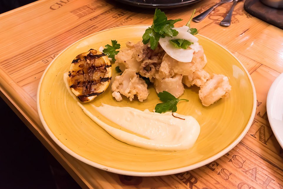 South Australian Squid rustically cut into rings are covered in a light batter and fried until blonde in colour and dressed with a chilli and fennel salt. The crunchy batter plays off beautifully with the tender squid and when combined with the crisp and refreshing shaved fennel and parsley salad makes for an uplifting, tasty bite. A squeeze of the charred lemon brings an intense citrus zing and magnifies the flavour of the salt.