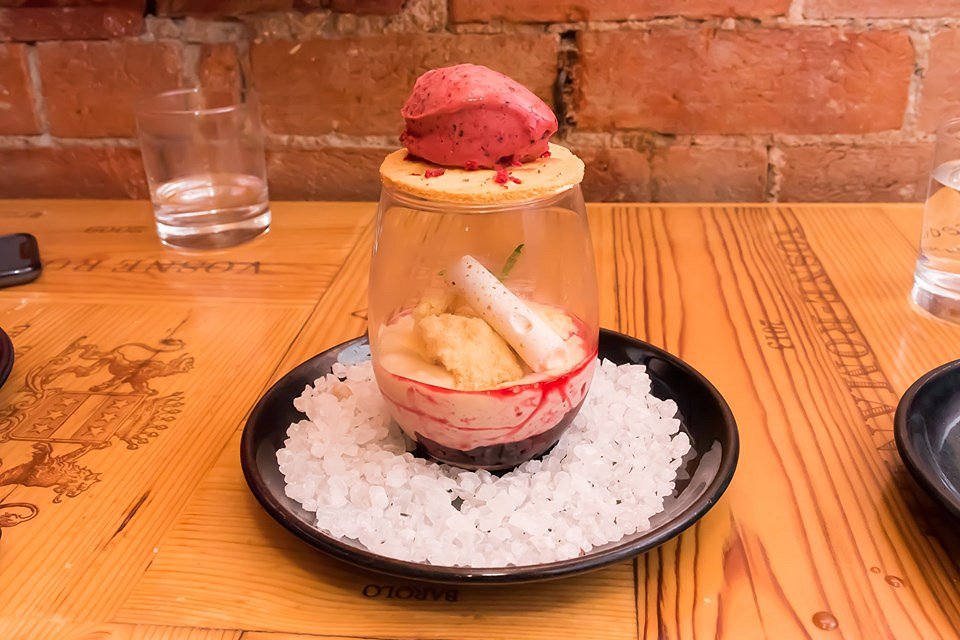 This deconstructed cheesecake is presented in a glass topped with a biscuit and a quenelle of rich, creamy and sweet berry sorbet that is bursting with dark berry flavours. Spoon downwards and you are rewarded with a thick Dulce de leche cheesecake filling, a texture that I can only compare with a rich body balm (perhaps because that’s what I wanted to do with it) entwined with sweet berry compote studded with macerated blueberries. The centerpiece is a cylinder of pistachio merengue, as delicate as a snowflake and dissolves on the tongue.