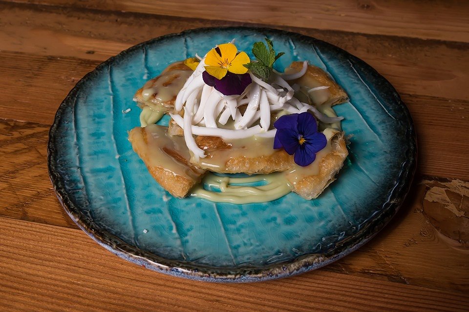 Coconut sorbet, sticky rice, coconut jelly in a deep fried bun. Sweet, sticky, and crunchy coming from a bun that is only prepared upon order so it comes out fresh and warm.