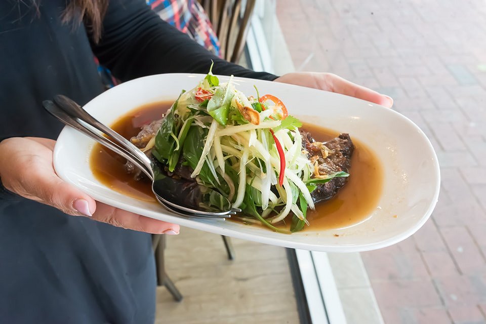 When you enter, you’re greeted by lovey smiles from staff and your eyes are instantly drawn upwards, to lines of colourful festival flags. To the left, a wall showcasing the beauty of Thailand through storyline photography of warm smiles, food and nature. Kin Kin Thai Eatery have created the perfect space for diners to feel like they’re in Thailand without actually being there. Co-owners and also Chef’s, Noppadol Sophon and Trinai Kiattiwong have put their experiences and minds together to curate a new menu that is both innovative and creative.