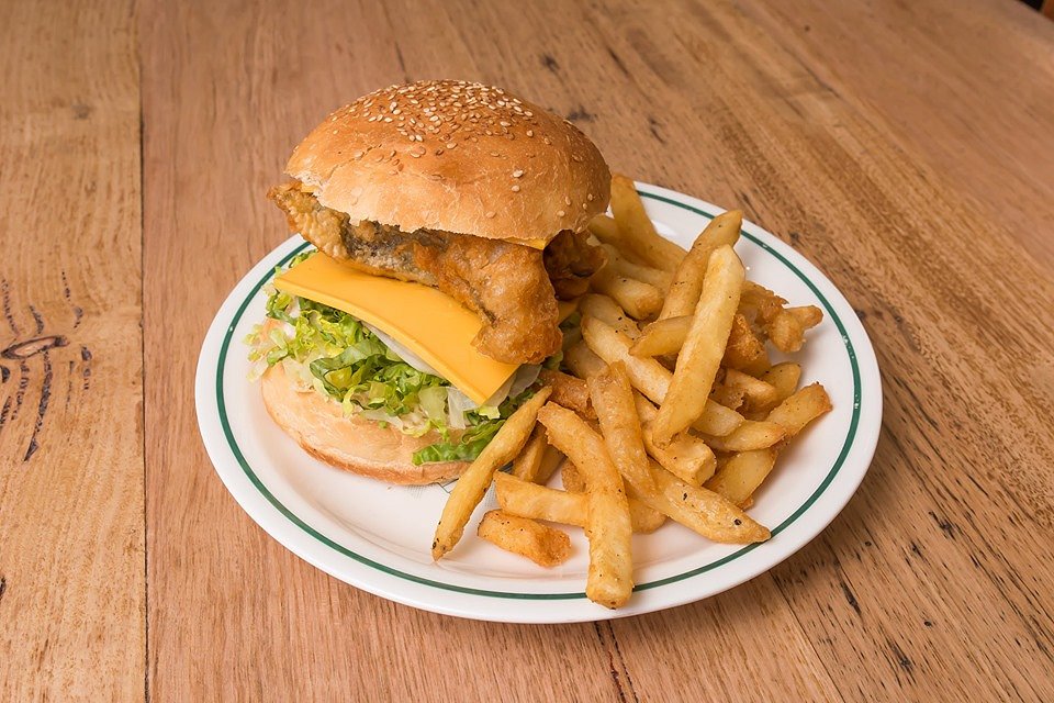 Fish Burger with American Cheddar, Lettuce, Pickled Fennel, Tartare and Fries