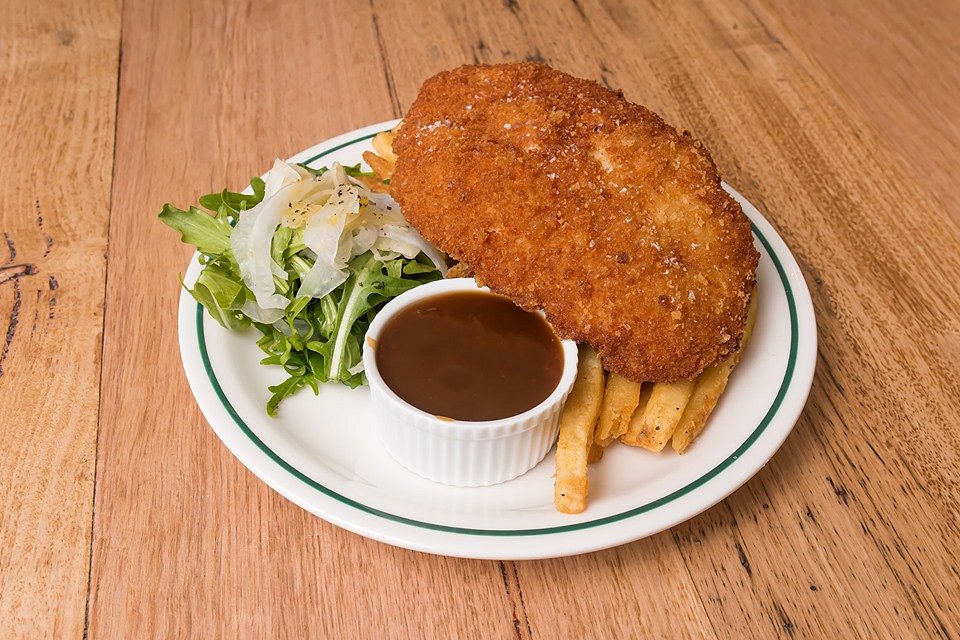 chicken schnitzel, which comes with rocket salad, fries and aioli.