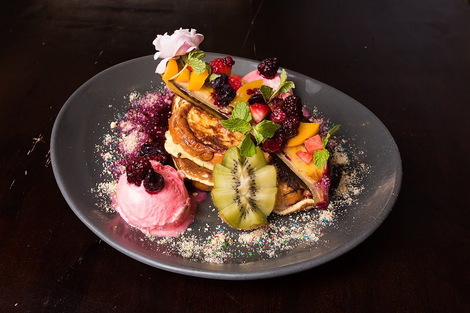 The Pink Frenchie is the perfect, pink dish to delight everybody who sets their eyes upon it. The thick and fluffy pieces of french toast are decorated with raspberry coulis and rose and pistachio ice-cream. Half of a caramelised banana is placed on top and decorated with seasonal fruits, mint sprigs and cookie crumbs, which add colour and crunch to the dish. The blend of the rose and pistachio ice-cream is an incredible combination, and with the french toast you get an almost vanilla-rose taste. The Pink Frenchie is an extravagantly presented dish, with beautiful colours and incredible sweet smells. The pairing of light and fluffy french toast with the smooth sweetness of the seasonal fruit is absolutely sensational, and the mint adds a cool and refreshing touch.