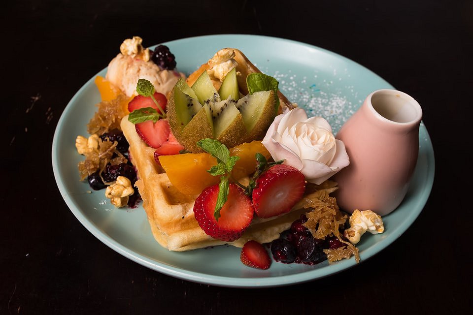 Simply the Best Waffles is exactly how they are described – simply the best waffles! The thick and fluffy waffles are served with fresh seasonal fruits, jaggery and cashew ice-cream and an exquisite butterscotch sauce. Caramel popcorn and caramelised coconut shavings add crunch to the dish, and compliment the butterscotch sauce. The seasonal fruits are sweet and add different textures to the meal, giving a fresh and fruity statement to compliment the decadent butterscotch sauce. Simply the Best Waffles are not overly sweet, allowing the meal to be enjoyed with the variety of flavours and a lightness which can be difficult to find in desserts. This dish is presented in a very simple and elegant manner, with the waffles and fruit placed together on one side, the ice-cream sitting beside it, and a light coating of icing sugar across the plate. The pastel-blue plate complimented the pink roses and serving jug on the plate, looking very minimal and elegant.