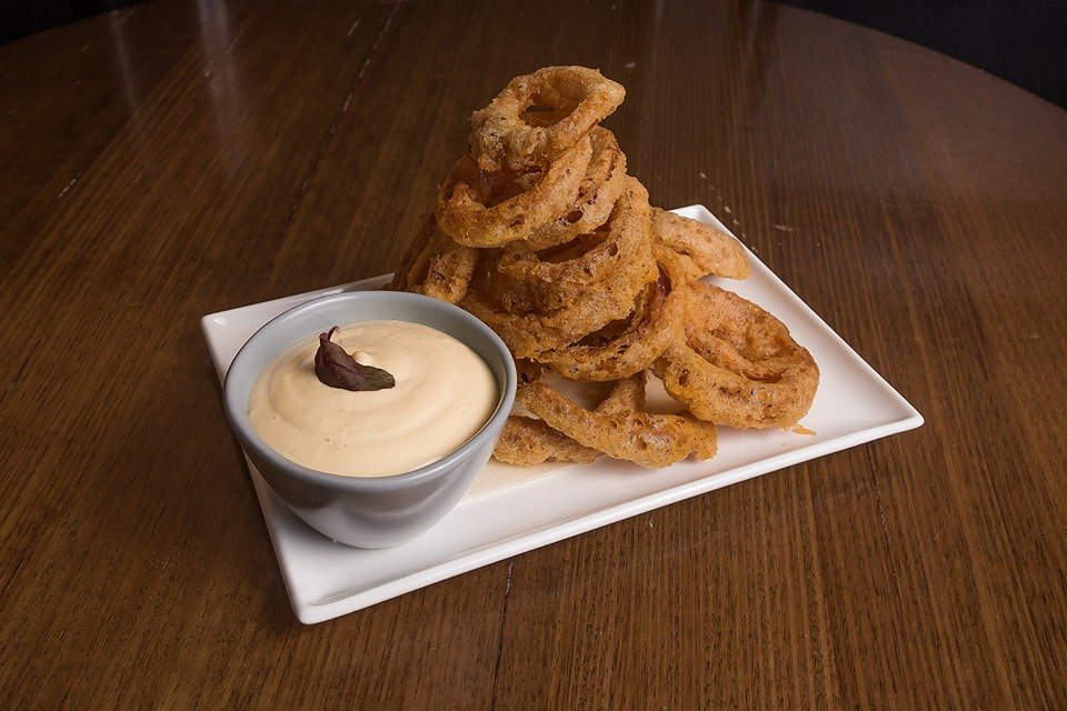 We began our meal with two entrees, the Bulgarian Feta Tart and the Onion Rings. The Bulgarian Feta Tart is a gorgeous sliced tart with a beautiful puff pastry base. The caramelised red onion base is sweet, and perfectly complements the light, salty feta. Preserved capsicum adds an exquisite taste and a splash of colour to the dish, and pairs nicely with the smooth simplicity of the spinach. It is the perfect balance of sweet, savoury, and salty! The Onion Rings are an interesting twist on a classic pub favourite. Red onion is battered in a light and crisp tempura-like batter. A gorgeous and creamy honey-mustard sauce is the perfect partner for the Onion Rings, and the rich creaminess works wonders with the crisp batter.