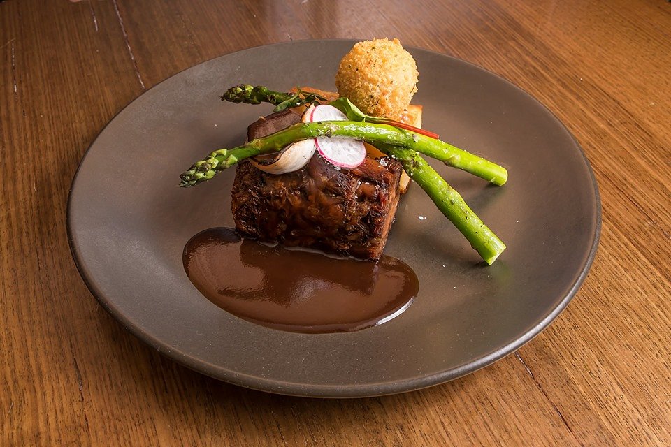 The Slow Roasted Lamb comes in a generous serving of succulent meat with a rich and decadent gravy. The meat is crisp on the outside, and then falls apart and melts in your mouth with an exquisitely rich flavour. A garlic butter ball comes on top of the lamb, and explodes (literally) with gorgeous and rich flavours when you cut into it. A layered potato bake is served on the side, and soaks up the gravy. The Slow Roasted Lamb is garnished with radishes and impeccable al dente, garlic-infused asparagus. A perfectly executed and beautifully presented dish, the Slow Roasted Lamb is a wholesome and delicious meal to enjoy year-round.