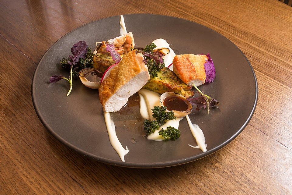 The Oven Roasted Free-Range Chicken Breast is a simple and elegant meal to please everybody. The chicken breast has a crisp outside, and beautiful inside which holds in the juices and is incredibly succulent. A decadent cream sauce complements the dish and adds a rich flavour, and garnishes of radish and fried kale add a lovely crunch and colour to the dish. A light, eggy frittata is served with the Oven Roasted Free-Range Chicken Breast and bursts with flavour. The light fluffiness of the frittata pairs nicely with the roast chicken and creates a gorgeous mixture of flavours which dance on the palate.