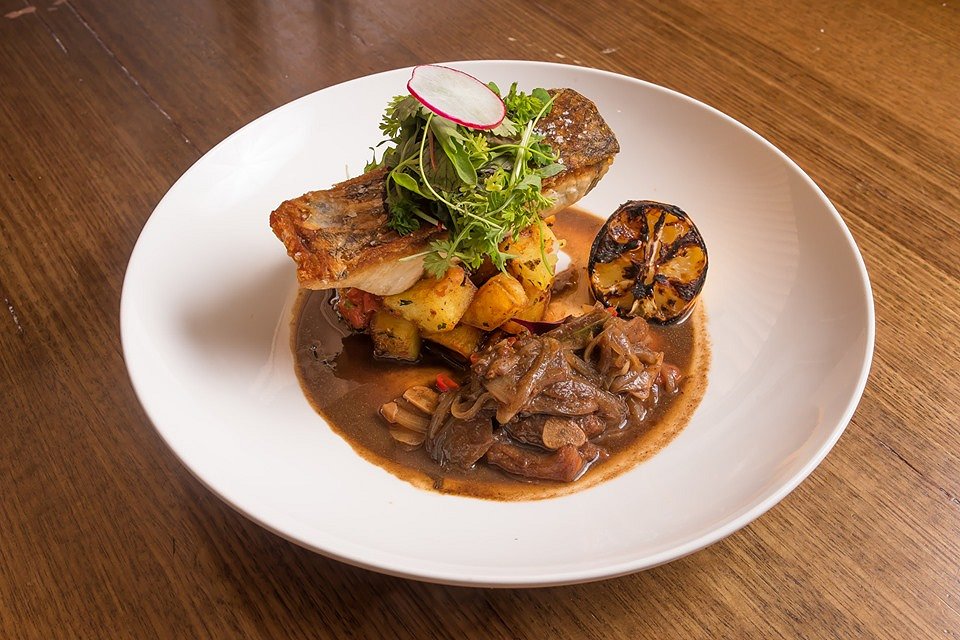 The Crispy Skinned Barramundi Fillet is just as the name describes: a beautifully succulent barramundi fillet with incredibly crispy skin. Served atop a bed of diced roast potato and with a light sauce, the Crispy Skinned Barramundi Fillet is a gorgeous and wholesome meal, perfect for the summertime. There is a perfect balance of succulence and crispiness which gives an incredible texture to the meal, and the potatoes burst with flavour as they soak in the sauce and the juices from the fillet. Assorted greens and radish garnish the dish, adding a burst of colour and some light flavours to complement the rich flavours of the meal.
