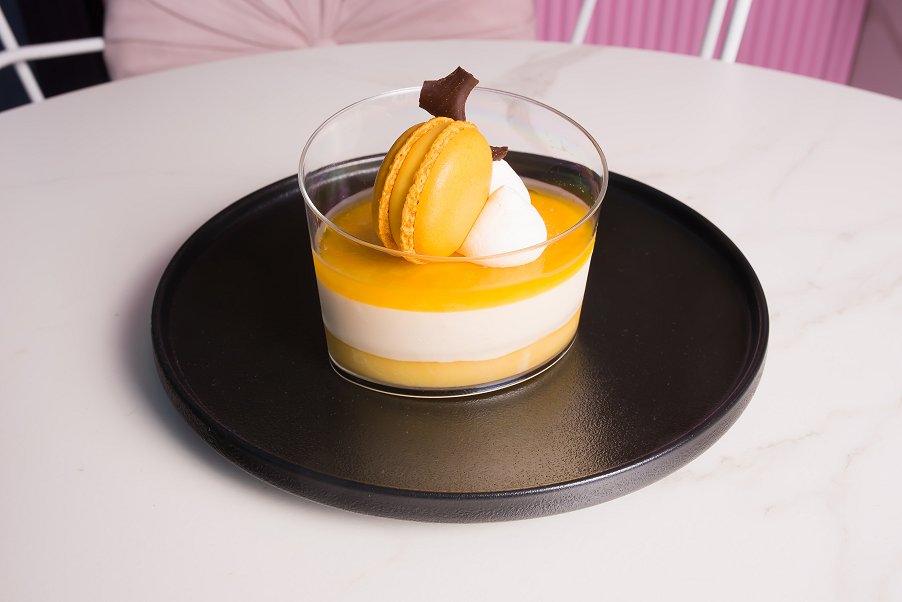 The Tropical Verrine is a beautiful, mango based dessert. Served in layers within a transparent bowl, the bright yellows of the dish are absolutely irresistible! A mango macaron sits atop the whipped cream, and breaks beautifully in your mouth when you take a bite. The outside of the macaron is crisp, and the inside is soft and sweet. A tangy citrus jelly brings the tropical sensation to the dessert, and a light mango jelly at the base complements the mango macaron. A layer of cream sits between the two jelly’s, and creates a gorgeous soft and fluffy texture to the sweet. It also allows the flavours to be subtle and light on the palate. The Tropical Verrine is the perfect sweet treat for the upcoming summertime, and is sure to be a massive hit!