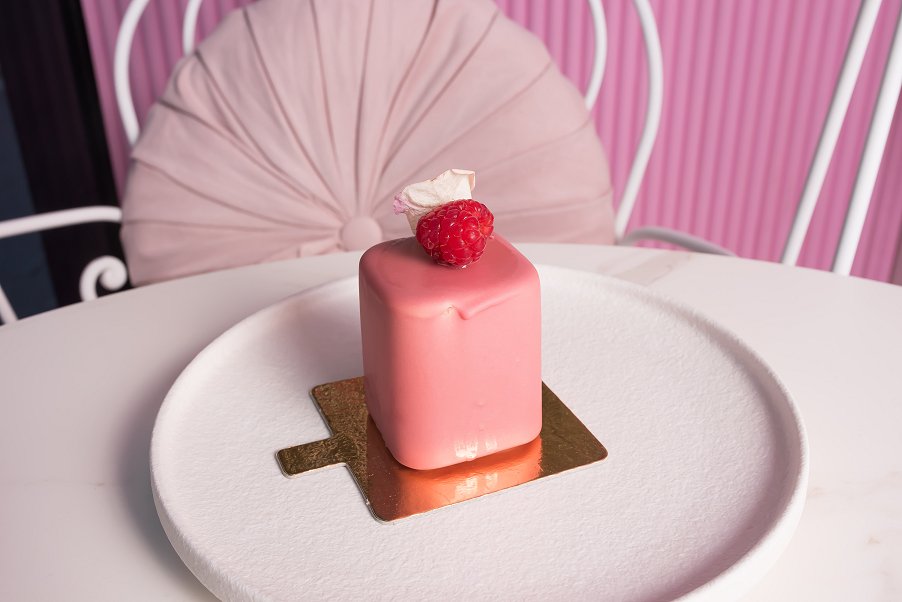 La Vie En Rose is an elegantly presented sweet, with the gorgeous natural-pink of the ruby chocolate shell and topped with a raspberry and white rose petal. A velvety chocolate rose mousse is hidden beneath the shell of the sweet and pairs beautifully with the texture of the ruby chocolate. A silky, raspberry jelly adds a slight tang, and the lychee cremeux infuses the dessert with the light and unique flavour of the fruit. La Vie En Rose is the perfect combination of flavours, the lightness of the rose and lychee blend beautifully together, and the raspberry gives a gorgeous burst of flavour! The simplicity of the presentation juxtaposes the intricate combination of flavours, and makes this sweet truly unique.