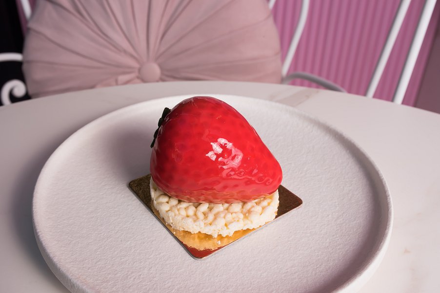 The Berrylicious is a giant glazed strawberry sitting upon a white chocolate rice puff and with a sensational, minty surprise inside! The presentation of this sweet is absolutely incredible, with each serving looking exactly like a large strawberry, with detailing for the seeds, shape, and stem. The outside of the Berrylicious is a light cream-cheese mousse and when you cut into it you find a gorgeous, frosty strawberry and mint compote. The white chocolate rice puff adds a crunch to the dish, and enhances the creaminess of the rest of the dessert. The Berrylicious is the sort of sweet that everybody can enjoy, as it has a beautiful assortment of flavours and textures, and it is the perfect level of sweetness for anybody to love.