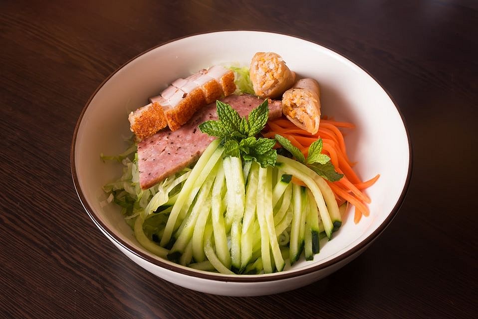 This dish is a mixture of vermicelli noodles at the bottom, topped with fresh salad such as lettuce, grated julienne carrots, cucumber and a considerable portion of meat with your choice of beef steak, roast pork, chicken, tofu, sugar cane prawns and the list goes on! This with added spring rolls gave it a complete look for a delicious and satisfying salad bowl.