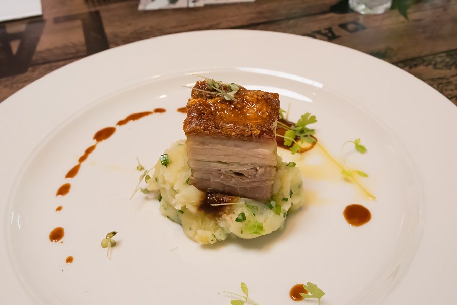 Asador Pork Belly Marinated with Stout, with Smashed Chive Potato