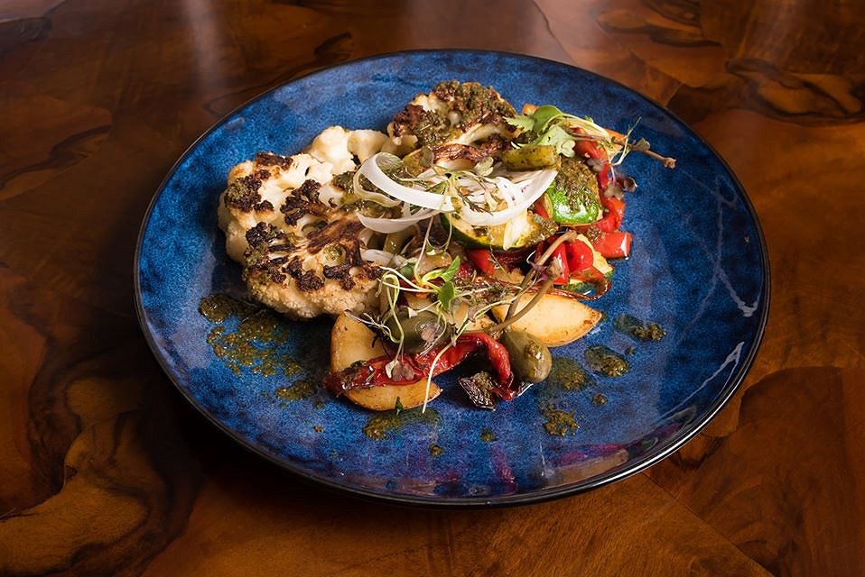 The Roasted Cauliflower possesses a smoky taste which enriches the cauliflower and generates a beautiful dish. The cauliflower rests upon a bed of piquillo mild peppers, baby potatoes, and caper berries. The well-seasoned, hearty vegetables contrast perfectly with the salty, unique taste of caper berries. This dish is full of flavour and life, and is perfect everyone as it is completely vegan.