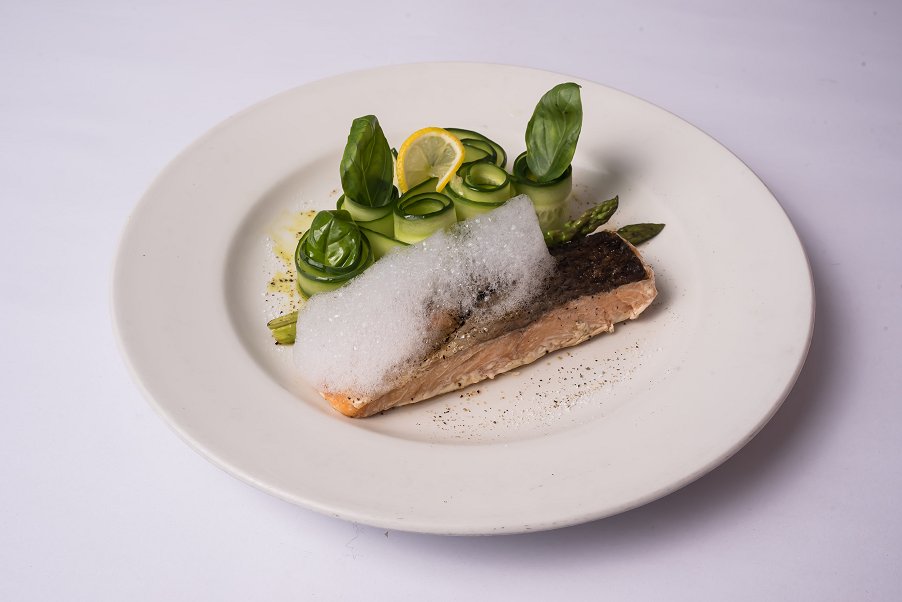 Grilled Salmon with Cucumber Ribbons, Asparagus and Lemon Foam
