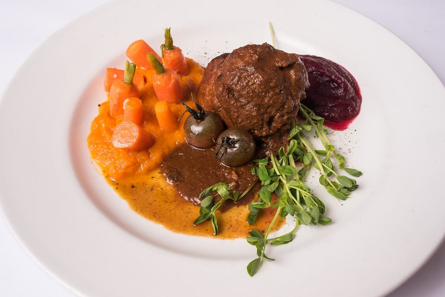 Wild Boar Backstrap with Beetroot and Plum Sauce, Baby Carrots and Greens