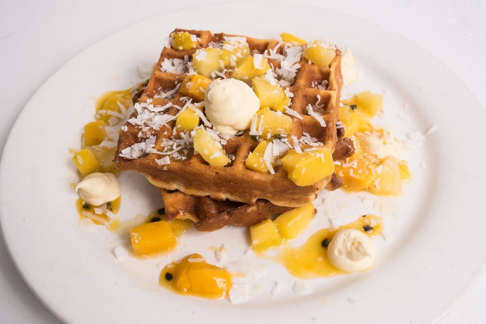The tropical topping paired with homemade waffles is a delicious, healthy and refreshing taste cleanser for those looking for a healthier option on the menu. With a mango and pineapple salsa, sweet passionfruit syrup a refreshing key lime cream and a slightly sweet addition of white chocolate and coconut, this dish is divine.