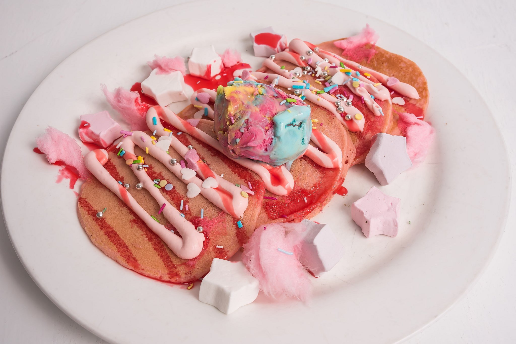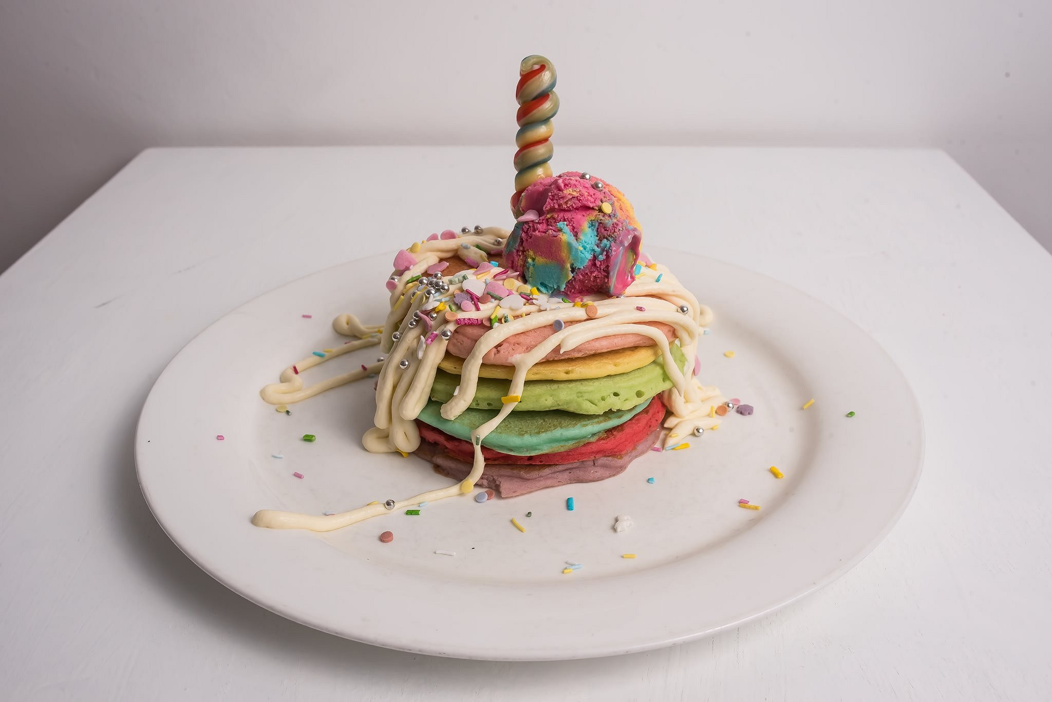 Like a rainbow cake, this incredible eye-catching stack of pancakes features the same delicious buttery pancakes in six different colours to reflect the rainbow. Served with milky and slightly sweet mascarpone and rainbow ice cream that resembles our childhood favourite Rainbow Paddle Pop!