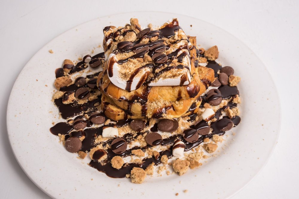 The Smores Waffles are basically heaven for chocolate and marshmallow lovers. Served with soft pillowy marshmallows, crunchy biscuits and chocolate chips and topped with a dark chocolate fudge sauce, this dish is rich and decadent in all the best ways.