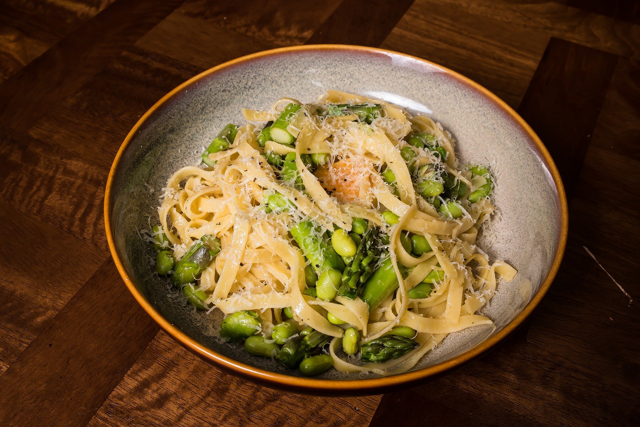 Wafu Pasta with Edamame, Yuzu, and Asparagus