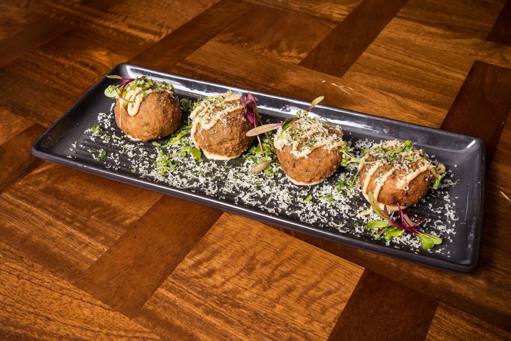 With burnt miso mayo and parmesan. Delicious, crunchy and sweet on the outside, with a creamy soft texture on the inside. They are a medium size of arrancinis and come in 4. Plenty for the two of us.