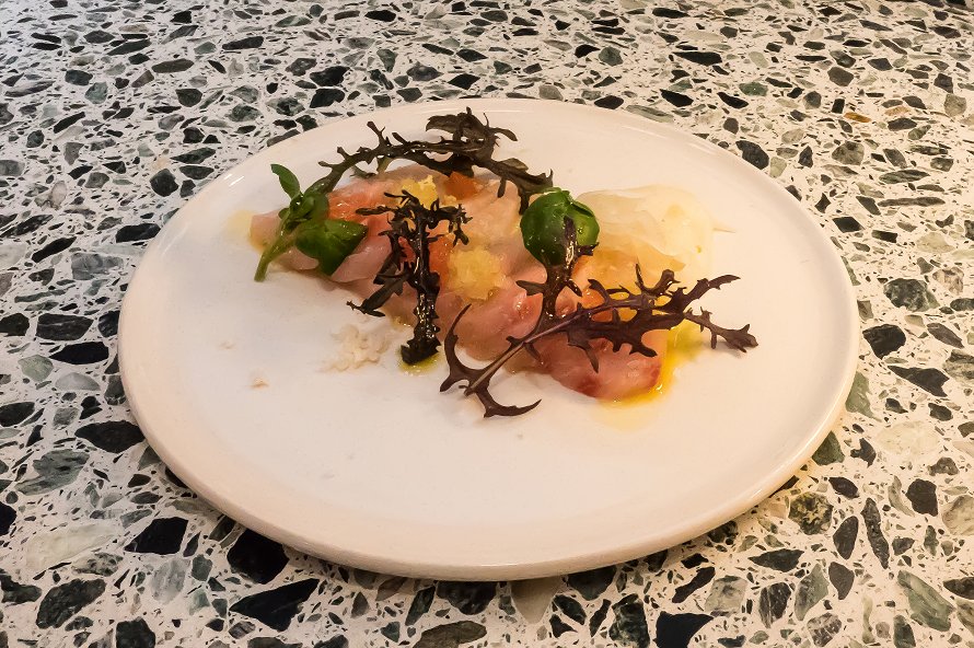 Kombu Cured Kingfish with Baby Fennel, Ruby Grapefruit and Mandarin Oil