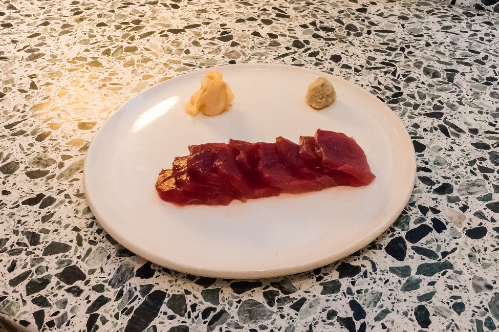 To create a good sashimi all you really need is fresh fish and a refined slice. What caught my eye with this dish was the brightly coloured tuna fish. I find that the fresher and tastier the fish the deeper the colour, and it didn’t get much fresher than this.