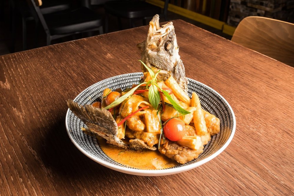 Fresh Local Crispy Barramundi Curry – boneless local barramundi in a Thai red curry and coconut milk.
