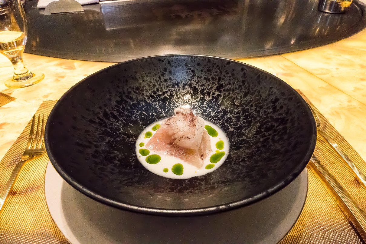 Our next course was Toothfish. Originally imported from Argentina, this fish was foreign to me. I had never heard of it, never tried it but am so glad that I was able to try it for the first time here at Erato. I thoroughly enjoyed it. Chef Sato called it the “wagyu of all fish” why? Because of the fat in their flesh that makes it so delicious. It’s a good fat that conserves omega 6 and omega 3. Just a very light, soft and pillowy texture in the mouth yet I felt so healthy eating this by the way Chef Sato was explaining it. This fish was paired with rice paper crackers, lightly fried thin slices of zucchini and chef’s special sauce that works well with the fish.