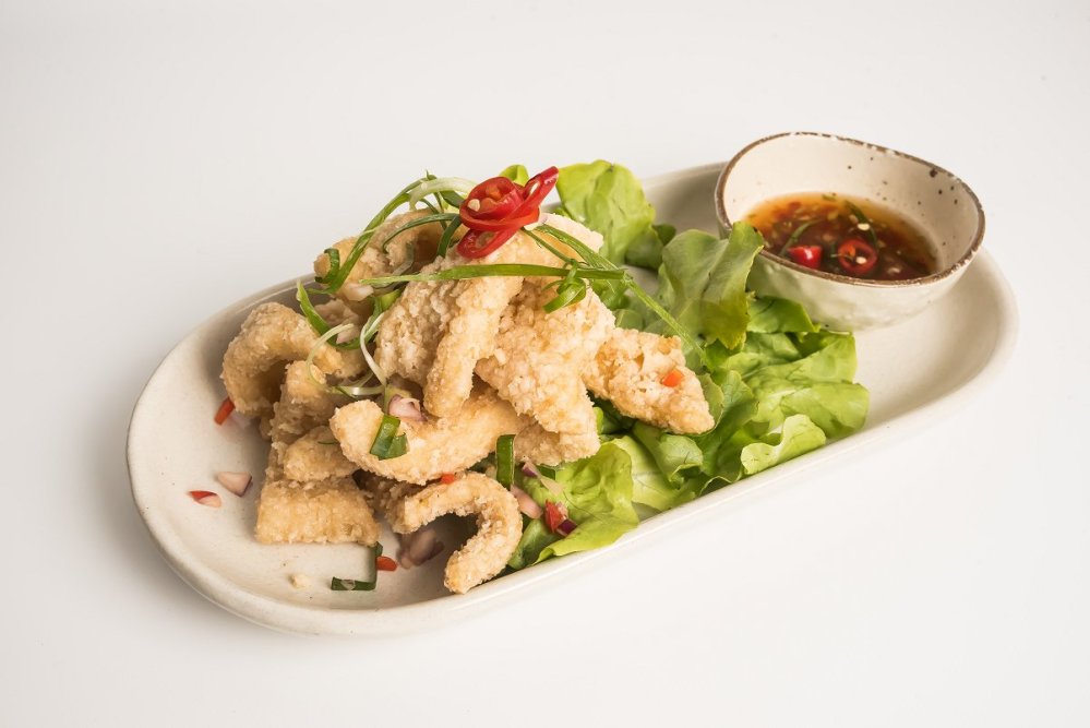 The Wok-fried Salt and Pepper Squid with Nuoc Cham is perfectly cooked in a light salt and pepper batter. The Nuoc Cham, a type of Vietnamese dipping sauce is light and zesty, with flavours of sweet chilli.