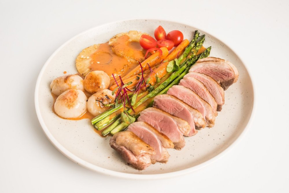 The Duck Breast with Lychee and Pineapple Curry is one of the most unique and delicious dishes on the menu! The duck breast is very rich in flavour and perfectly cooked to a rosy pink. The red curry sauce is beautiful and spicy, and the flavours mingle perfectly with the sweet pineapple and lychee, creating an incredible combination of flavours and textures. Roasted asparagus and carrot and fresh cherry tomatoes decorate the plate and bring lots of colour and flavour to the dish.