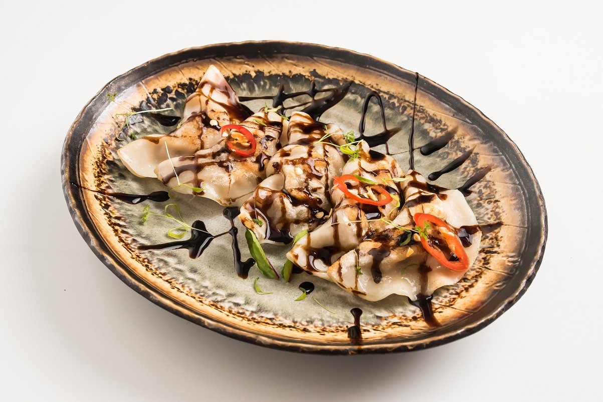 Perfectly lined up in a row, the Chicken Dumplings with Balsamic Reduction are a gorgeous version of your typical chicken dumplings. Beautiful aromas and flavours of ginger emit from the dumplings as you take a bite, and the well-seasoned chicken filling melts in your mouth. The balsamic reduction adds a mild tang to the dish, and perfectly complements the rich chicken filling.