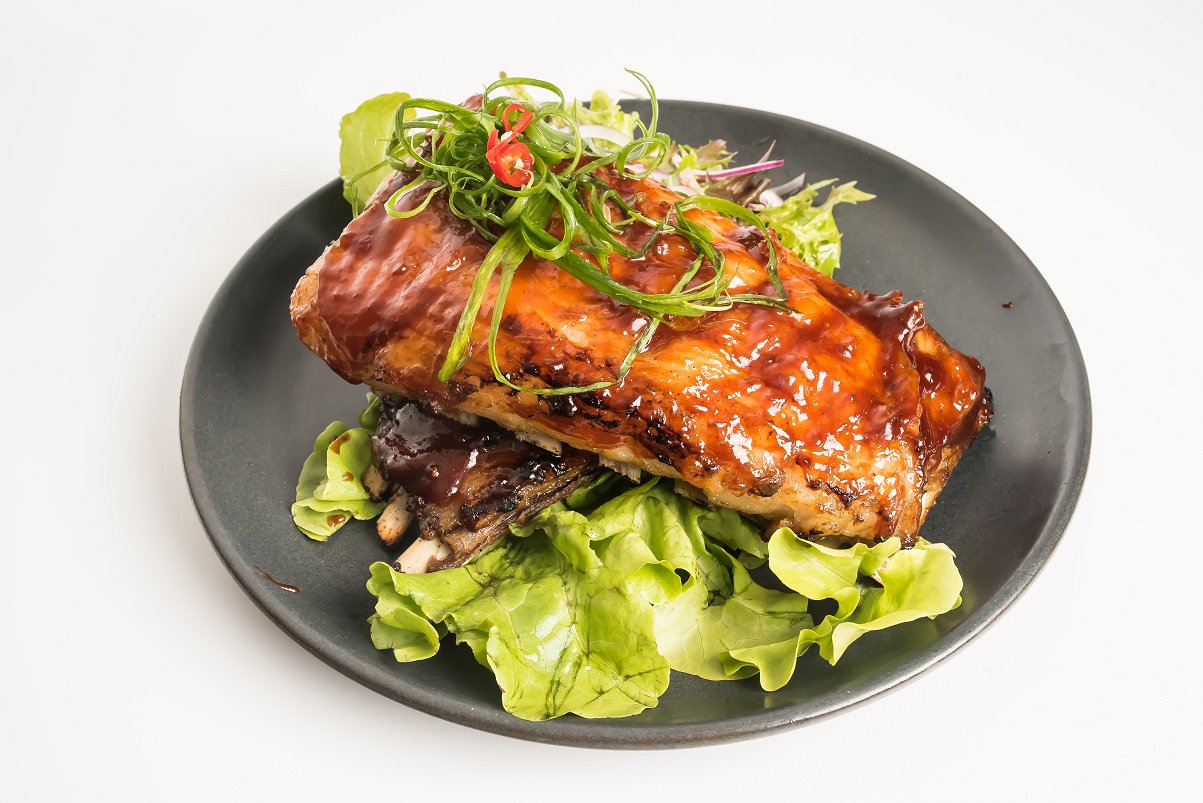 The Twice Cooked Lamb Ribs with Asian BBQ Sauce are thick and fatty and coated in a sweet hoisin sauce glaze. A simple and light salad of cherry tomatoes, onion and lettuce with a light vinaigrette are the perfect pairing for the rich and juicy lamb ribs.