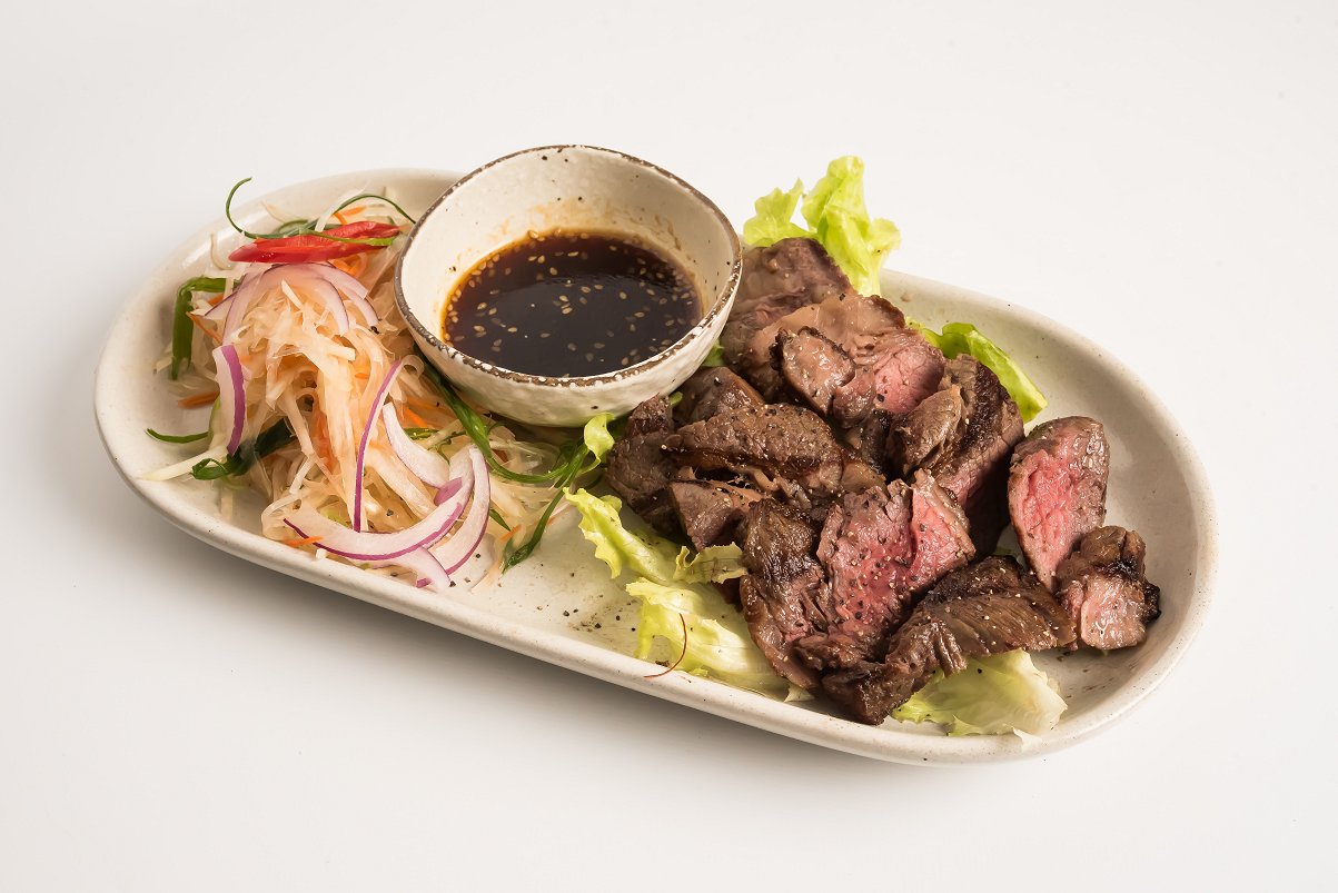 The BBQ Wagyu Beef with Green Papaya Salad has beautiful summery flavours, while still offering rich, tender bbq Wagyu beef. The salad consists of shredded papaya, chilli and carrot and is very crunchy and tangy with an underlying sweetness. The dish is served with a sweet, sesame soy sauce which brings a sweetness to counterbalance the rich beef and tangy salad.