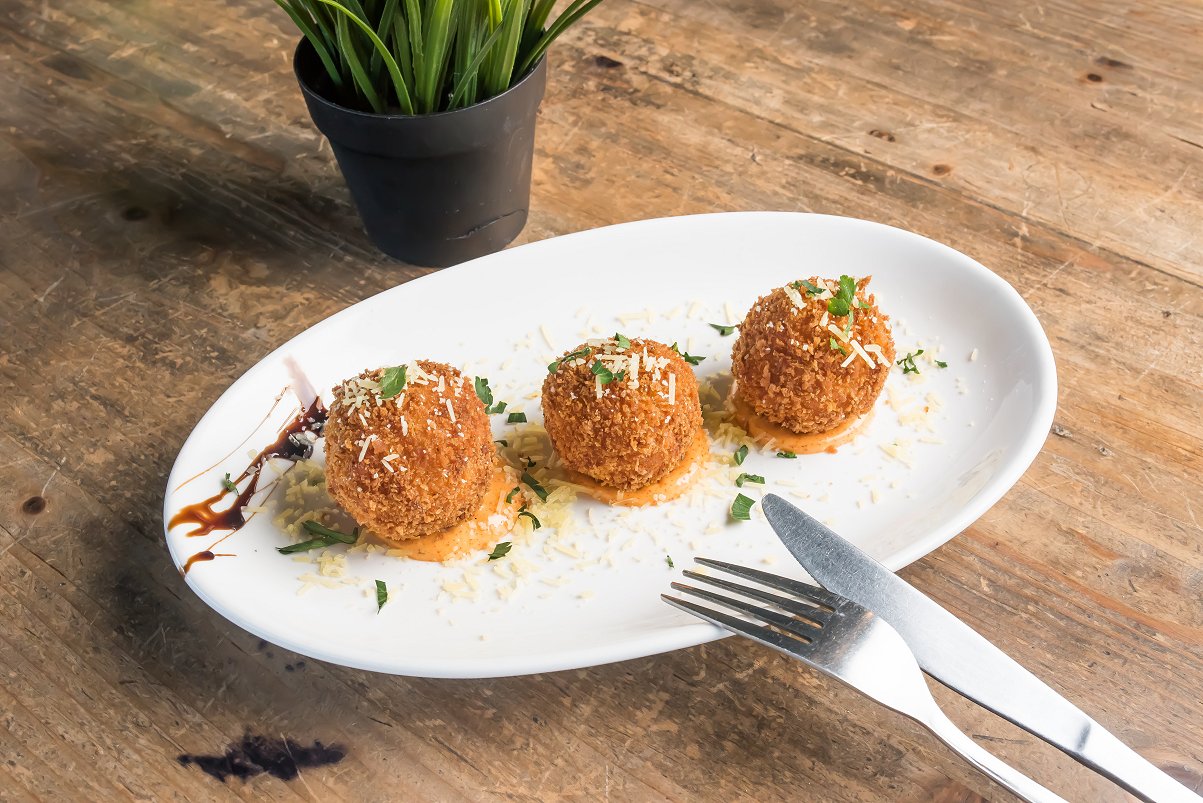 The Pumpkin and Feta Arancini Balls are crisp on the outside and creamy on the inside. The rice has a gorgeous saffron infusion and this goes beautifully with the rich pumpkin and feta flavours. The arancini come on a bed of spicy paprika aioli and is topped with parmesan cheese and basil to garnish.
