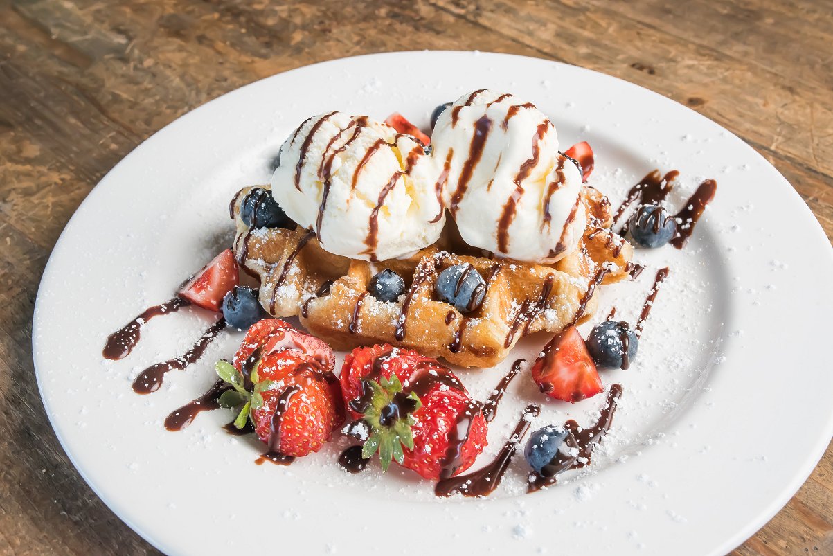 A fluffy Belgium waffle topped with creamy vanilla ice cream, sweet melted Nutella, whipped cream and fresh blueberries and strawberries, the Naughty Waffle is a drool-worthy dish to sate any sweet tooth! The waffle is thick and has granular sugar pearls, just like in a traditional Belgium waffle. Dusted with icing sugar, this dish is just as good as it looks.